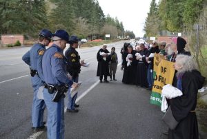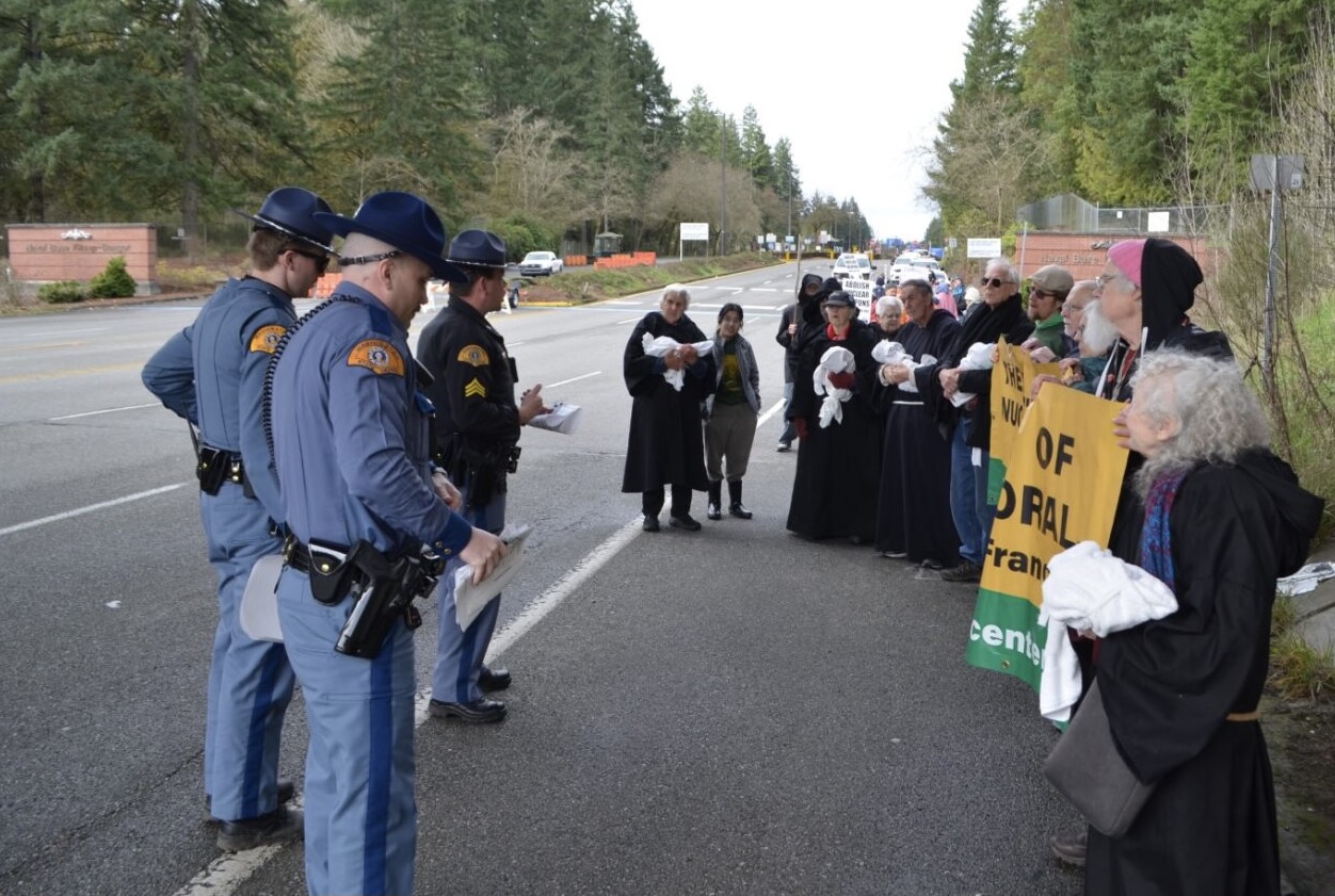 On the morning of March 5, more than 40 nuclear resisters of many faiths took part in a procession to the entrance of Naval Base Kitsap-Bangor from the nearby Ground Zero Center for Nonviolent Action in Poulsbo, Washington. Twelve of the Pacific Life Community (PLC) activists, calling for the abolition of nuclear weapons, walked into the roadway to block traffic. They held signs and displayed a large banner with a quote from Pope Francis: “The Use and Possession of Nuclear Weapons is Immoral”. Some of them carried small bundles wrapped in white shrouds, symbolizing infant victims of war.
